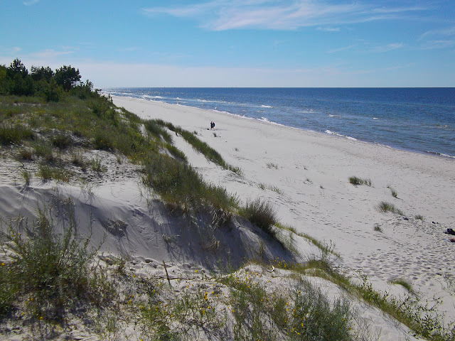 Nie zastanawiam się długo i lecę popływać w pustym morzu. Woda ciepła (jak na Bałtyk), piękne słońce - no bosko. Po kąpieli tylko kawałek do Mrzeżyna. Wieczorem spacer po plaży i molu.